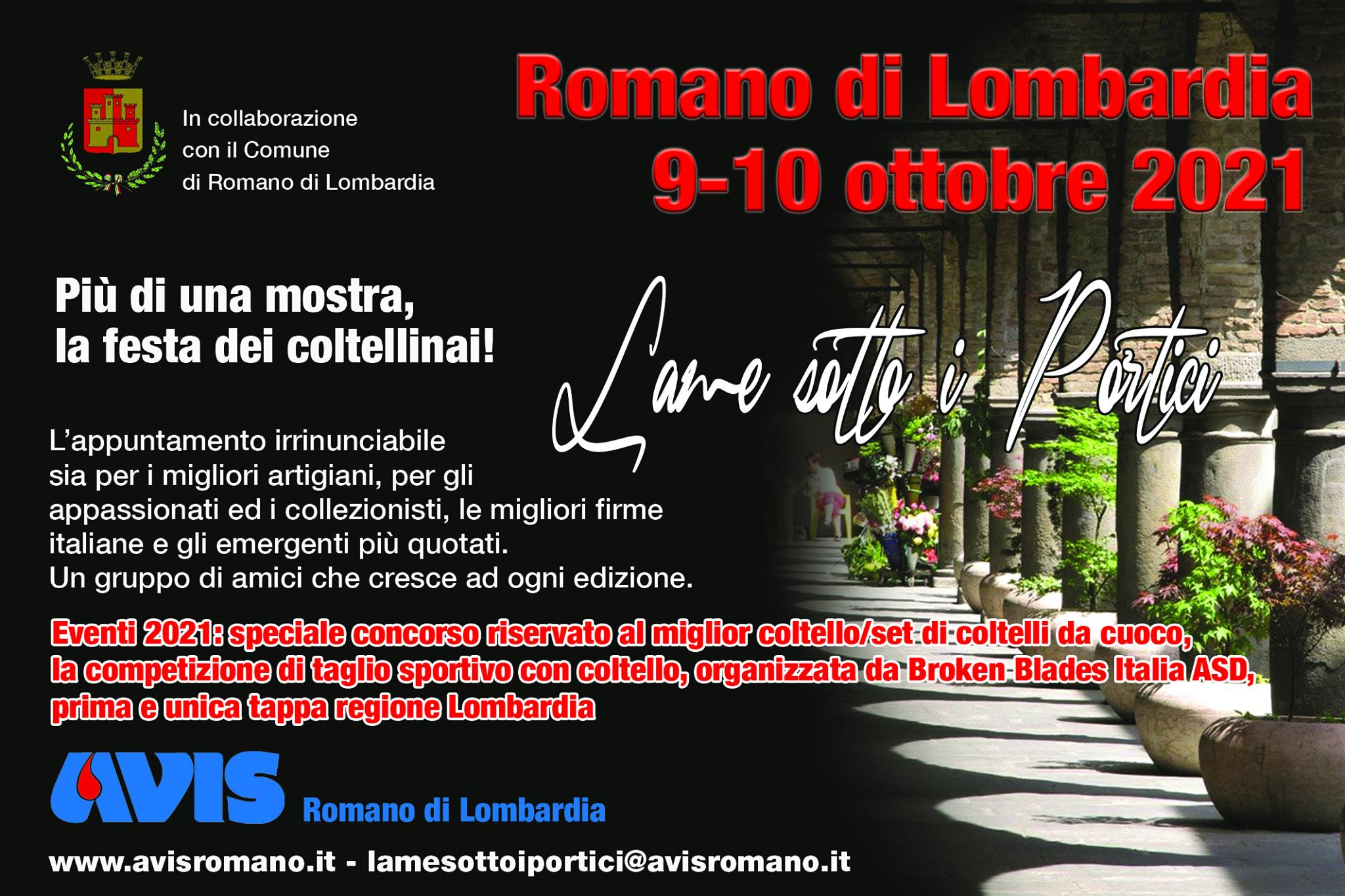 “Lame sotto i portici” torna a Romano di Lombardia sabato 9 e domenica 10 ottobre 2021. Un centinaio di coltellinai esporranno i loro lavori nella cittadina in provincia di Bergamo, sotto i portici quattrocenteschi della via Colleoni.